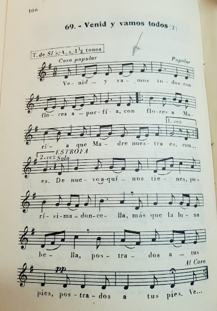 De nuevo aquí nos tienes, purísima doncella, más que la luna bella, postrados a tus pies, postrados a tus pies. Venid…